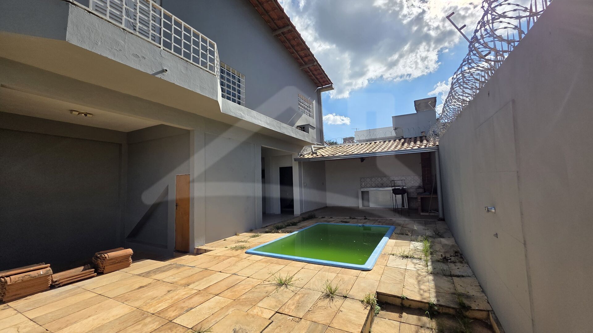Área de lazer com fogão a lenha, piscina e lavabo